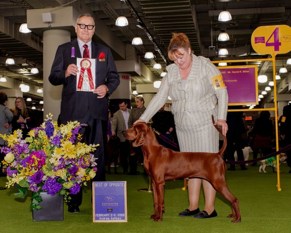 Fanci is one of the most titled and health tested Redbone in the breed's history. She has competed every year since turning 6 months old and has over 50 Group Placements & a Best In Show. She's our most outgoing & seasoned dog and has retired from the show ring except for now and again going to play with Jessica.